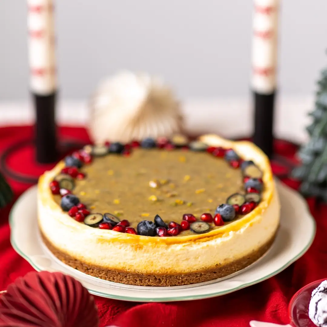 Classic cheesecake with a twist. Crispy oat biscuits, soft cream cheese and a white chocolate pistachio cream with fresh fruits.